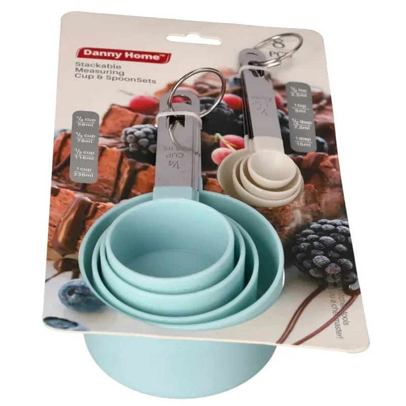 Stackable 8 Piece Measuring Cup & Spoon Set. Suitable for measuring both wet and dry ingredients.