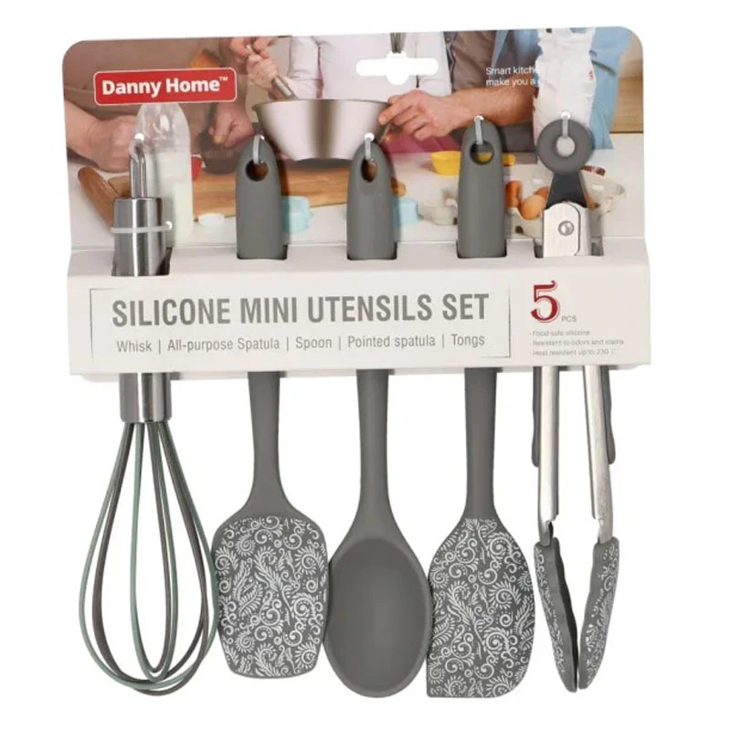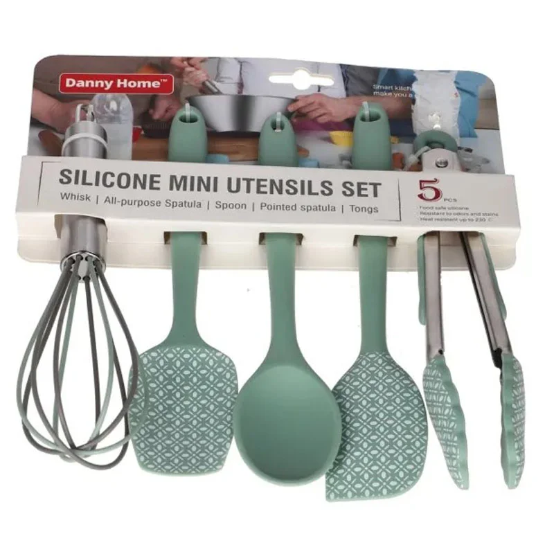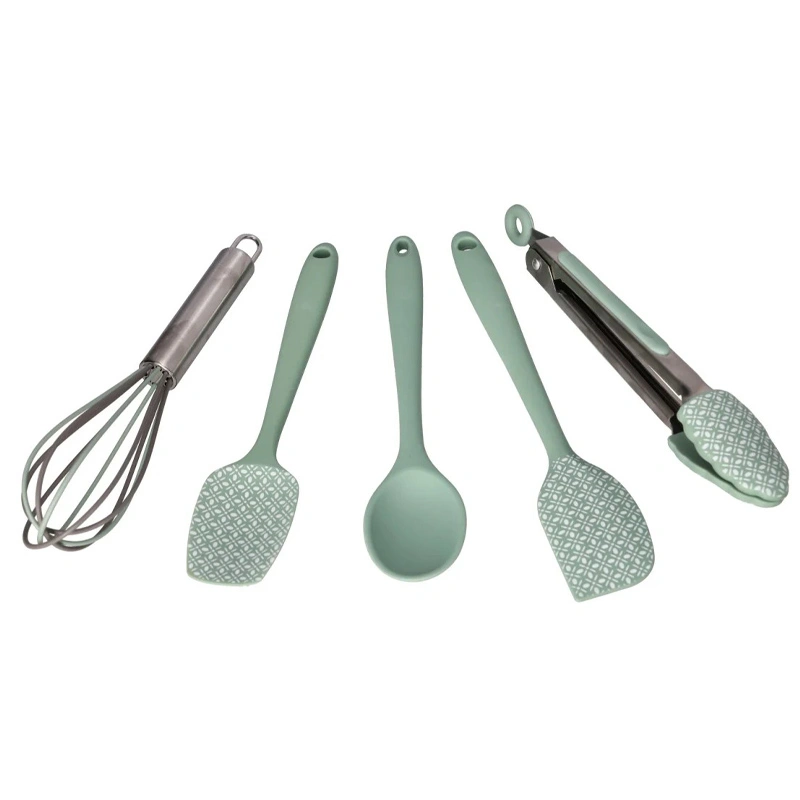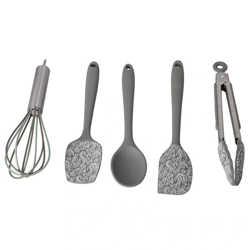 Set includes kitchen spatula, scraper, soup spoon, premium whisk and food tong.