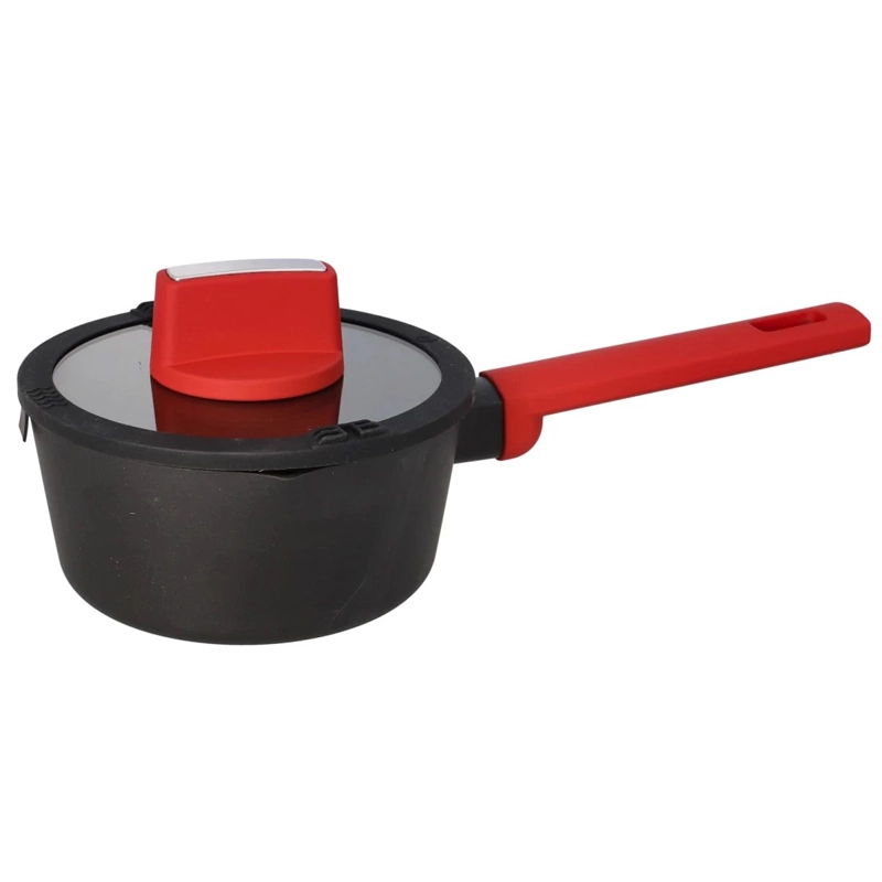 Durable non-stick cookware sauce pan with a transparent glassware lid and a long handle.