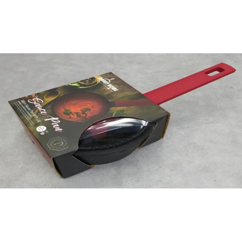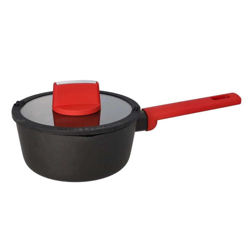 Durable non-stick cookware sauce pan with a transparent glassware lid and a long handle.