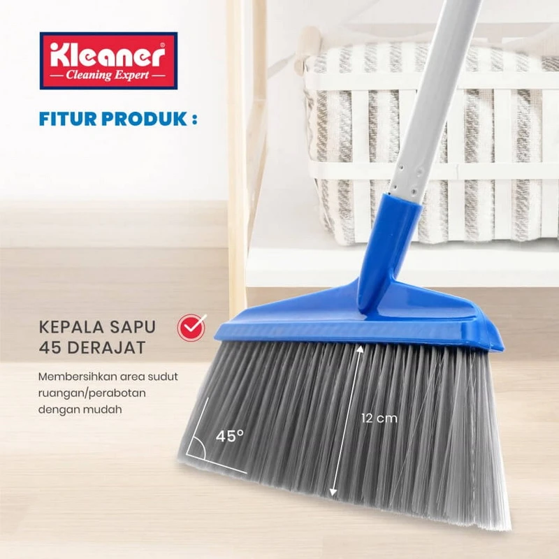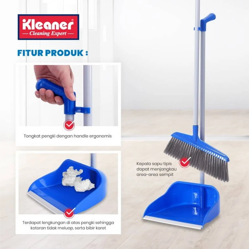Kleaner Broom & Dustpan Set is made to maximize your sweeping ease. The dustpan stick is complete with a handle for comfortable holding and the form of the dustpan with a small roof is to prevent large dirt / garbage from falling.