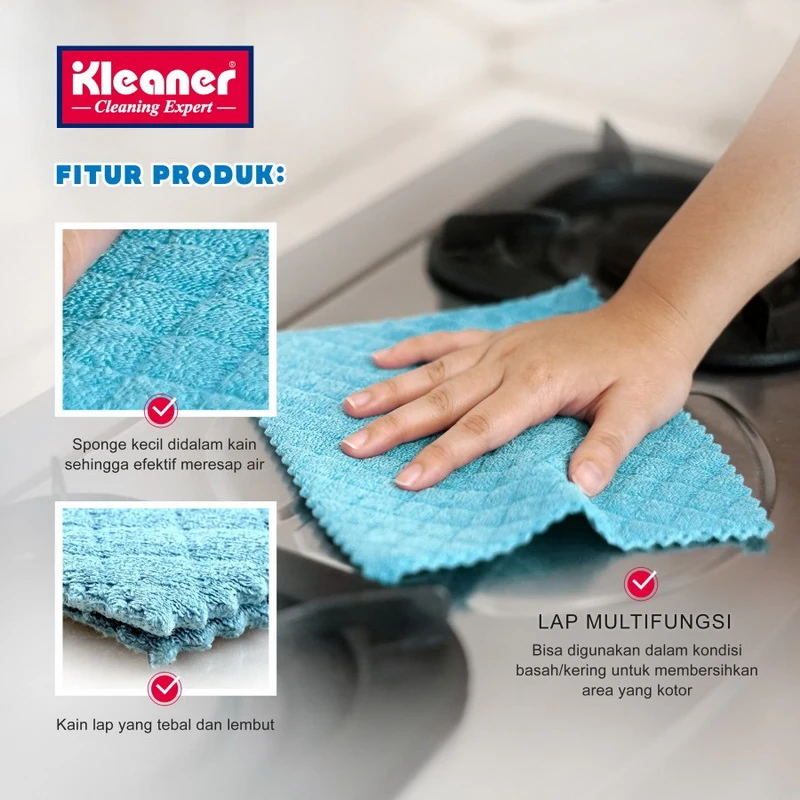 Kleaner Sponge Washcloth is thicker and different from conventional microfiber cloths, where this product is equipped with “Micro Sponge” technology that is embedded under the layer of the microfiber cloth, so that the cloth can absorb more water. It is suitable for cleaning stoves, microwaves, ovens or other household appliances.