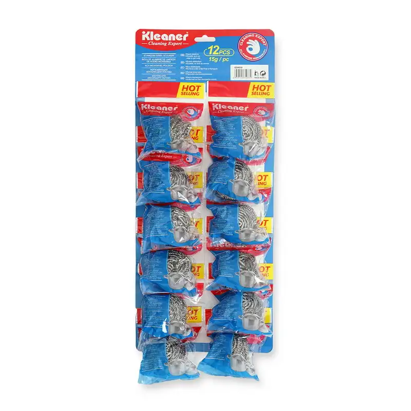 Kleaner Stainless Scourer 12 pcs is coir made of stainless steel which is suitable for cleaning stains / scale on pans, tableware, sinks and others. Stainless steel is thick and comfortable to grip because it weighs 15 Grams.
