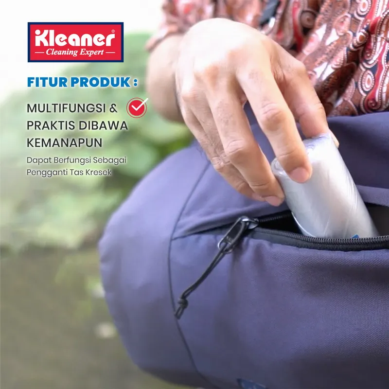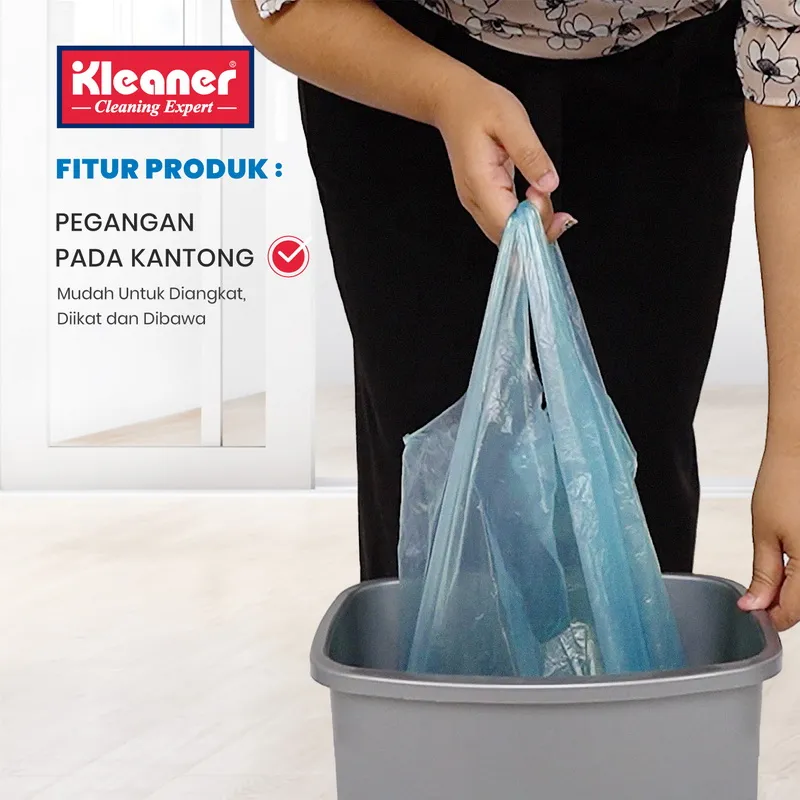 Kleaner Trash Bag Dengan Handle Roll is a strong plastic trash bag capable of withstanding heavy and hot loads. It is prepared in a roll form for practical storage and easy use.