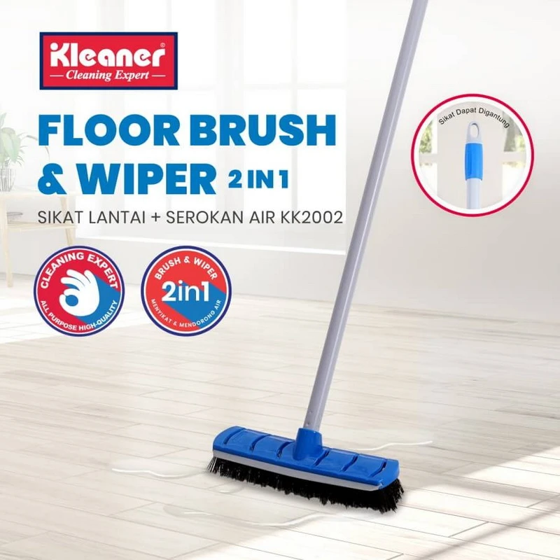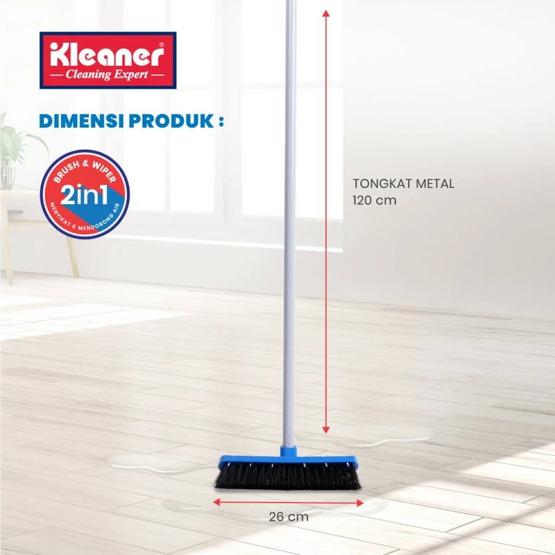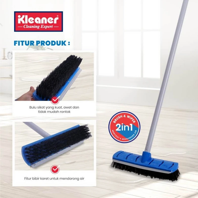 Kleaner Floor Brush & Wiper 2 in 1 is equipped with a floor brush and also a water pusher for more efficient use. It saves space at home, as there is no need to store the floor brush and water plunger separately. Equipped with a telescopic stick that can be adjusted in height.