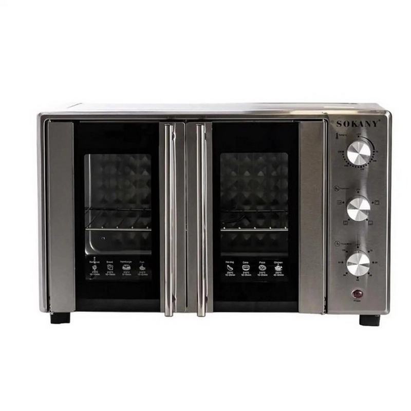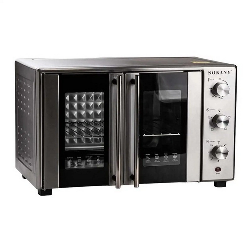 The Sokany SK-10027 is a 50-liter electric oven with 1700W power, a 60-minute timer with auto shut-off, and a maximum temperature of 250∘C.