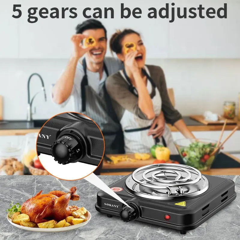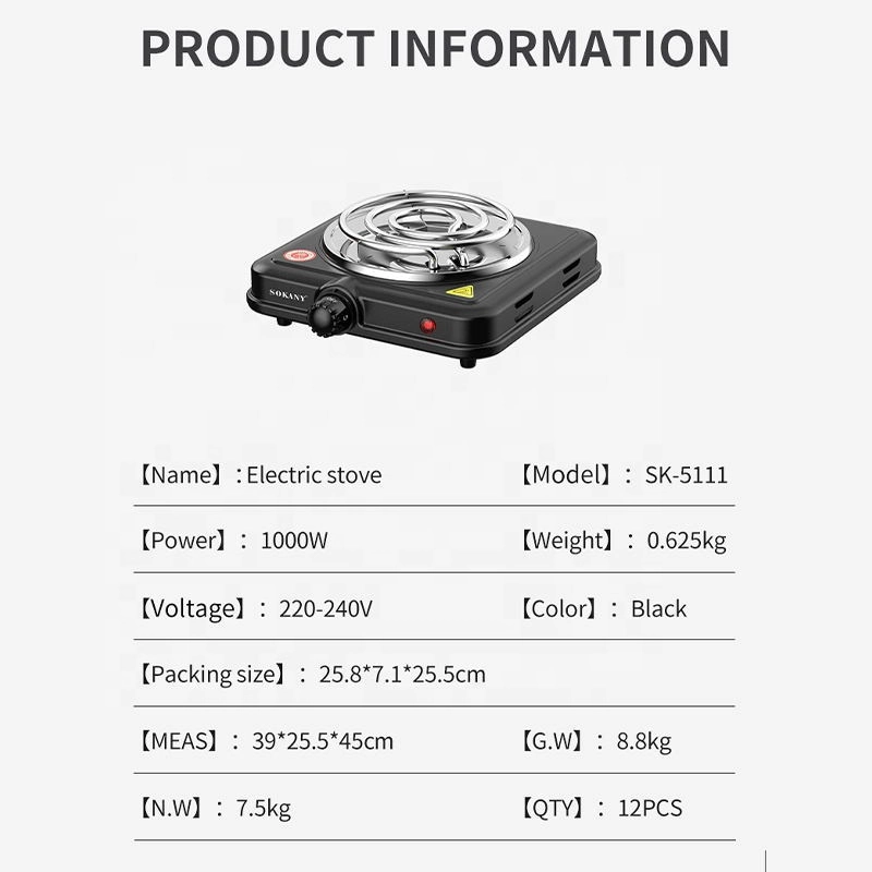 The Sokany SK-5111 is a single-burner electric stove with a 1000W power output, featuring a stainless-steel body and a durable, easy-to-clean enameled work surface. It is a compact, portable appliance suitable for small kitchens or limited spaces, designed with mechanical controls and anti-slip feet for convenience and stability. Key features include a coil heating element for quick and even heat, multiple heat levels, and compatibility with various cookware.
