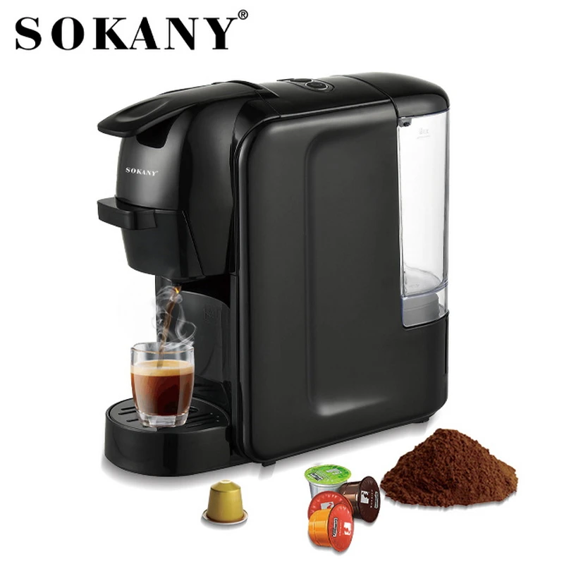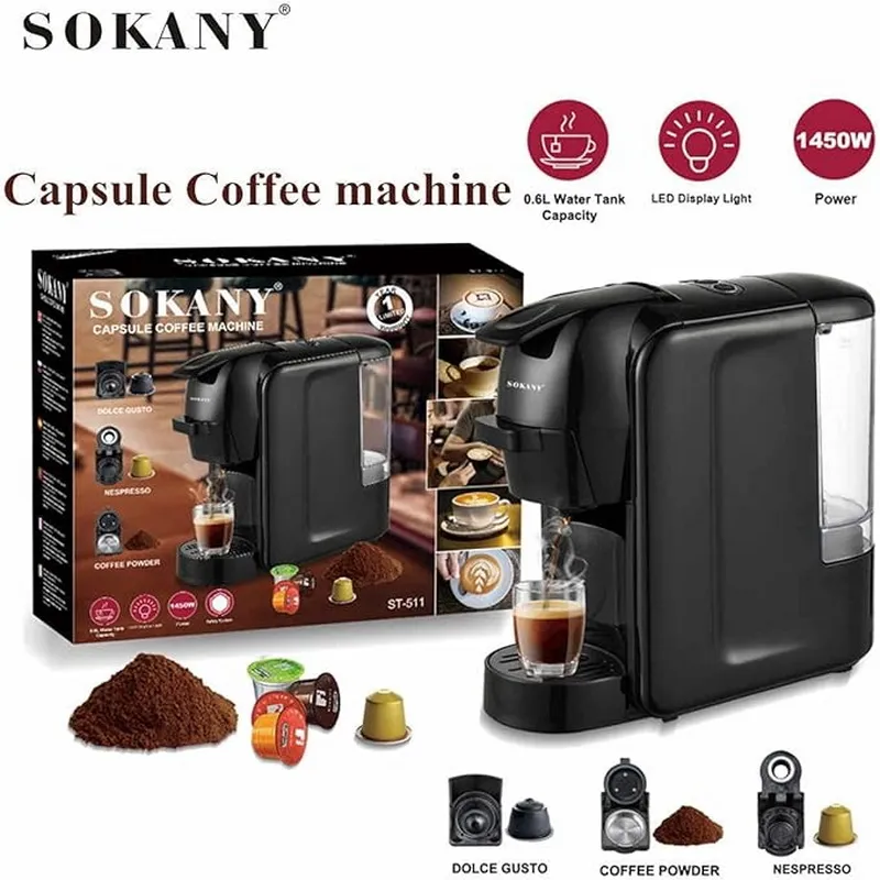 The Sokany SK-516 is a 1450W, 3-in-1 capsule espresso coffee machine designed for compatibility with Nespresso, Dolce Gusto, and coffee powder capsules. It features a 19-bar pump, a 0.6L removable water tank, and can brew short or long espressos automatically or with a manual stop. Its key features include an easy one-touch brewing system, a 15-minute automatic shut-off, and a removable drip tray for placing different-sized cups.