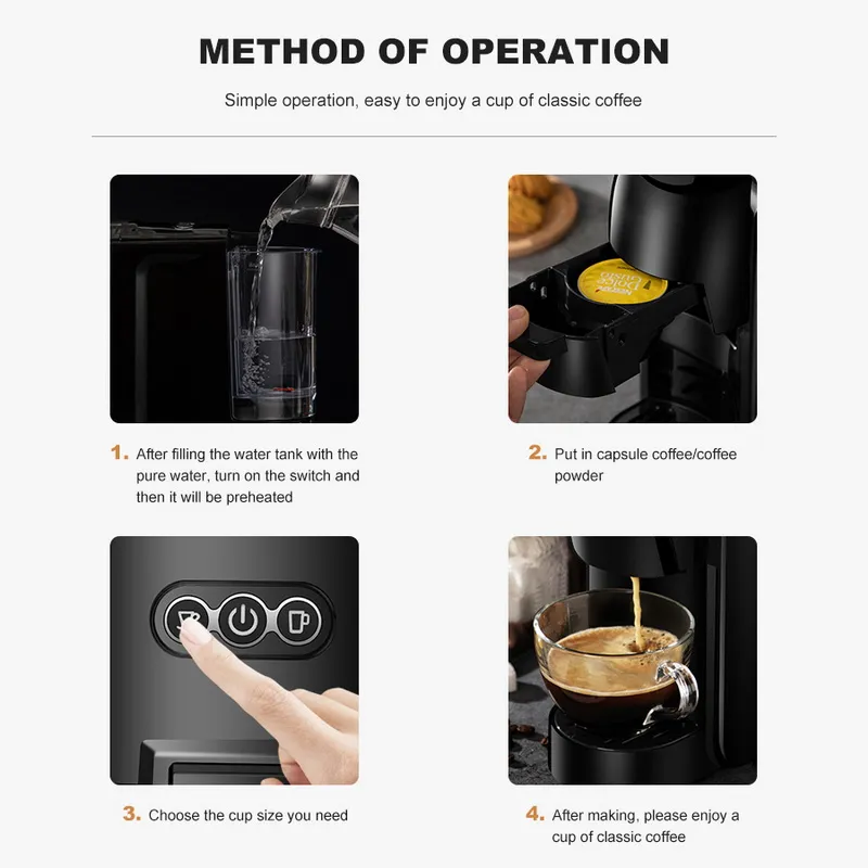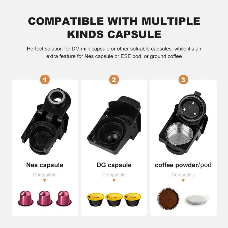 - Capsule Compatibility:Â 3-in-1 system, compatible with Nespresso, Dolce Gusto, and coffee powder capsules