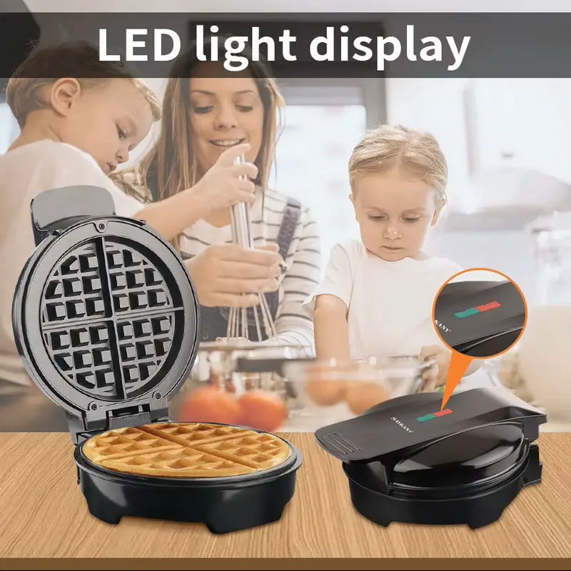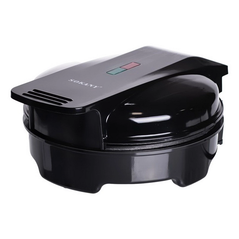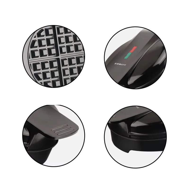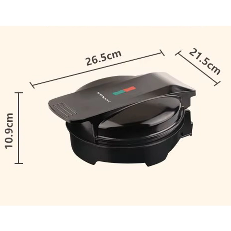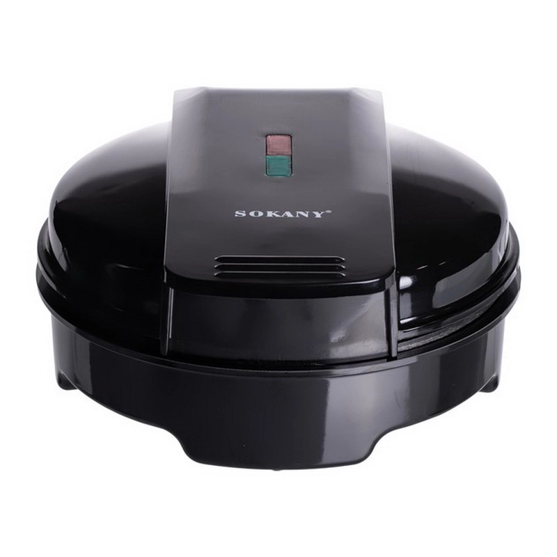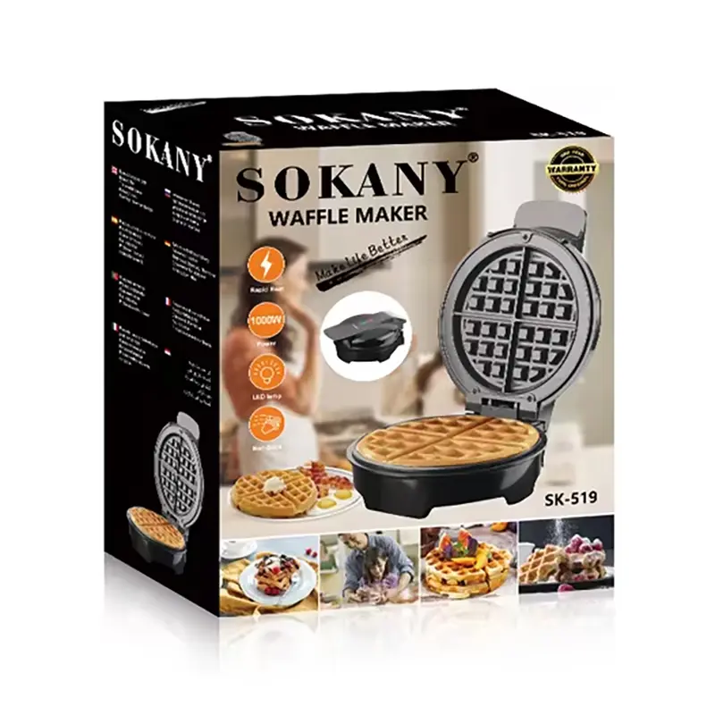The Sokany SK-519 is a 1000-watt electric waffle maker with non-stick plates, a thermostat for temperature control, and an easy-to-clean design. It can be used to make waffles, paninis, and other griddled foods, with indicator lights to show when it’s ready and a compact design for easy storage. Some versions have both waffle and flat plates, while others are designed for a single large waffle.