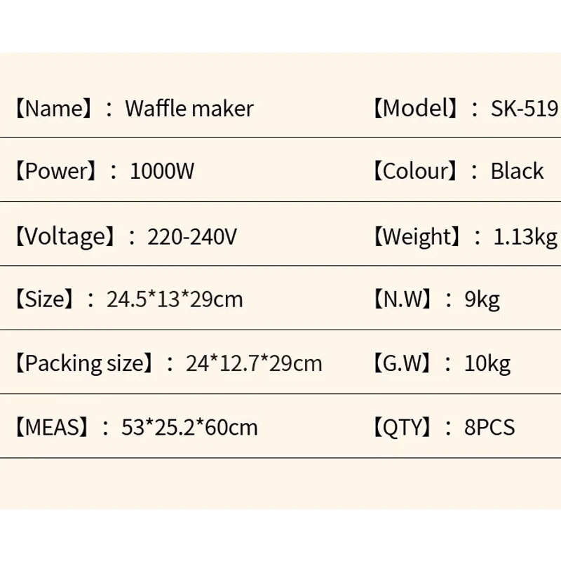 The SK519 Electric Waffle Maker features a non-stick cooking surface, making it easy to clean and ideal for home or commercial use. With a powerful 1000W performance, it ensures quick and even baking for delicious waffles. Its compact size of 24.5*13*29cm saves space while the stainless steel and plastic build provide durability. Suitable for household and hotel use.
