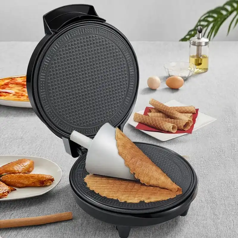 This ice-cone maker features a non-stick coated plate for easy cooking and cleaning. Its cool-touch Bakelite body ensures safe handling during use. The thermostat control allows for precise temperature adjustments between 210-230°C for perfect results. The indicator lamp clearly displays the operational status, and the overheat safety protection ensures secure use. With a power rating of 1000W and compatibility with 220-240V,50/60Hz, this appliance is a reliable and efficient choice for making delicious ice cones.