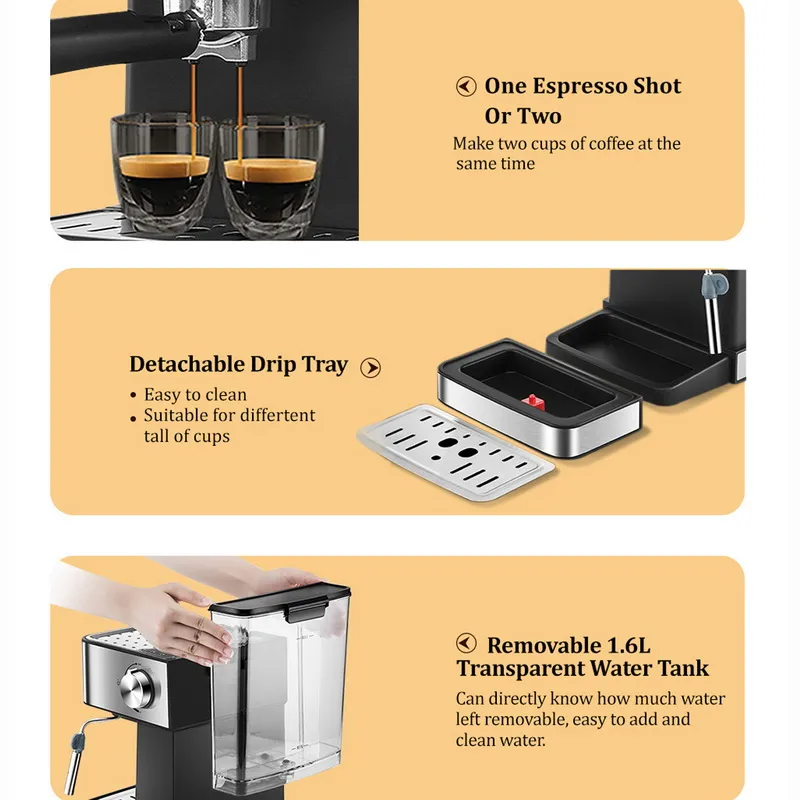Sk-6862 Coffee Maker15Bar 1.6L Water Tank 850W Dual-Stainless Filter Aluminum Alloy Boiler,15Bar or 20Bar high pressure pump 1.6L detachable transparent water tank Die-casting aluminum alloy boiler Aluminum alloy filter holder attached with dual-stainless filter Safe and reliable, with overheating and overpressure protected device Detachable frothing nozzle and drip tray for With PCB control 4buttons for one cup, two cups, or water and steam function220-240V 50/60HZ 850W