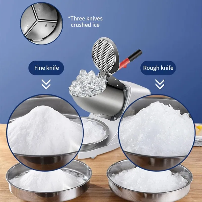 This ice crusher is designed with rubber anti-slip rings at the bottom for stability and safety. It features multiple outlets for effective heat dissipation, ensuring optimal performance during use. The adjustable thickness setting allows you to meet different product needs, whether you prefer fine or coarse crushed ice. Equipped with three types of blades—fine, rough, and standard—it offers versatile ice-crushing options for various applications.