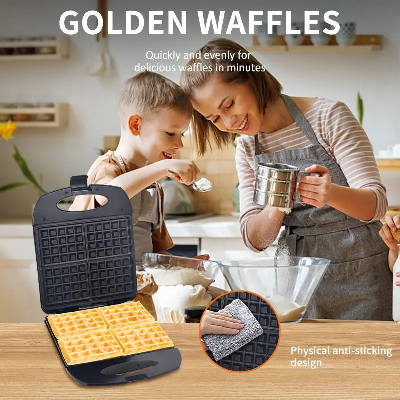 Enjoy delicate, restaurant-quality waffles baked to golden perfection with the Sokany 4 Slice Waffle Maker. This easy-to-use waffle iron features non-stick coated plates that release fresh pancakes easily and is easy to clean as well. Its compact and convenient design stores vertically in the cabinet to save space on your worktop Power – 1400W Waffle Plate 4 Slice Cool Touch Shell Non-Stick Coated Heating Plate Easy Grip Handle Heating Element Guide Light LED Lamp
